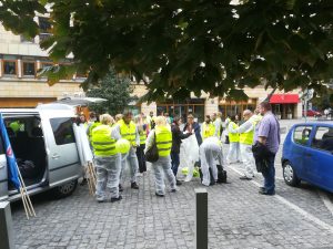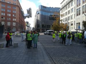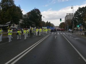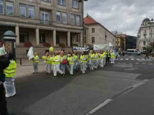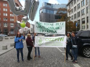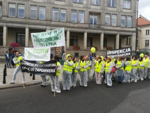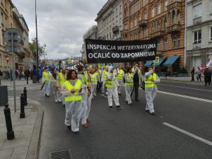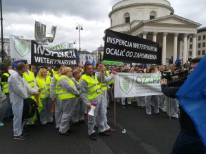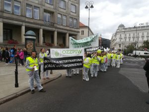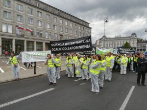 Protest rozpoczął się spotkaniem na ulicy Mysiej, gdzie rozdaliśmy akcesoria i przebraliśmy się w stroje „ochronne”. Zwarci i gotowi ruszyliśmy na Plac Trzech Krzyży. Nieskromnie powiemy, że wyróżnialiśmy się na tle protestujących. Stanowiliśmy niejako atrakcję turystyczną, co chwila padały pytania co to takiego ta Inspekcja Weterynaryjna. Plac pomału się zapełniał. Z naszych obserwacji wynikało, że byliśmy najprawdopodobniej najmniej liczną grupą (to dla tych co się burzą, że nikt o nas nie wspomniał, że nie było nas w telewizji i gazetach). Po 12 marsz ruszył pod siedzibę Prezesa Rady Ministrów, gdzie poprosiliśmy o przekazanie naszych postulatów do Premiera Mateusza Morawieckiego (pismo załączamy). Pod wpływem chwili, spontanicznie zdecydowaliśmy udać się pod MRiRW. Manifestacja zakończyła się pamiątkowym zdjęciem oraz nagraniem zaproszenia dla MRiRW do spotkania się z nami (w uzupełnieniu do pisemnych wersji ).